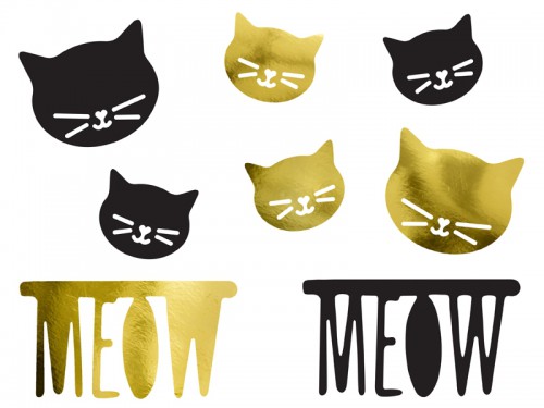 Deze set bestaat uit 8 poezenkopjes/meow. Gemaakt van karton. De kleuren zijn zwart en goud. Leuk om te decoreren op de feesttafel.