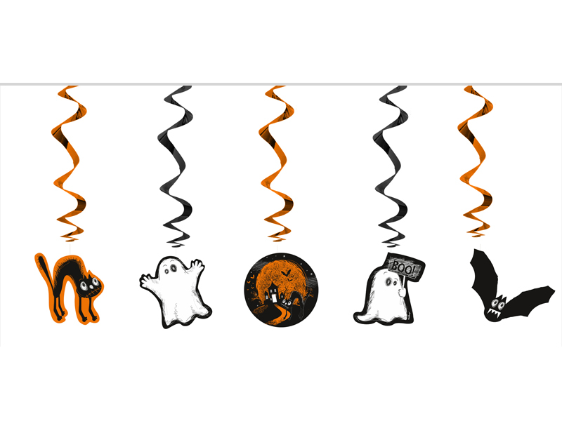 Een set van 5 swirls met Halloween hangers in de kleuren oranje en zwart. De lengte van de swirls zijn ongeveer 60cm.