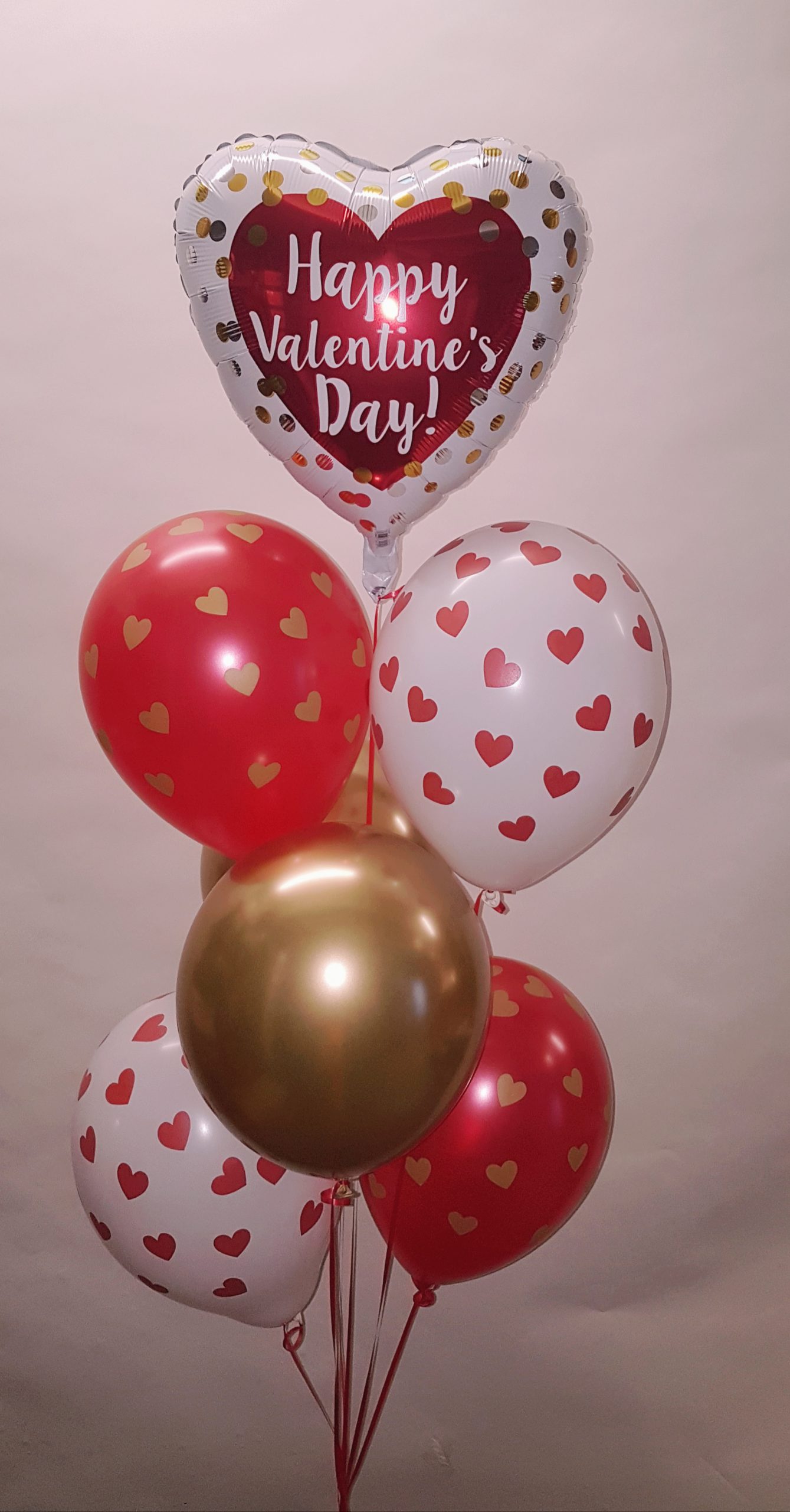 Dit boeket bestaat uit 1 folieballon in hartvorm en 6 latexballonnen aan een gewicht. De ballonnen zijn gevuld met helium en de latex ballonnen zijn behandeld met hi-float voor een langere zweefduur. De kleuren zijn goud, rood en wit